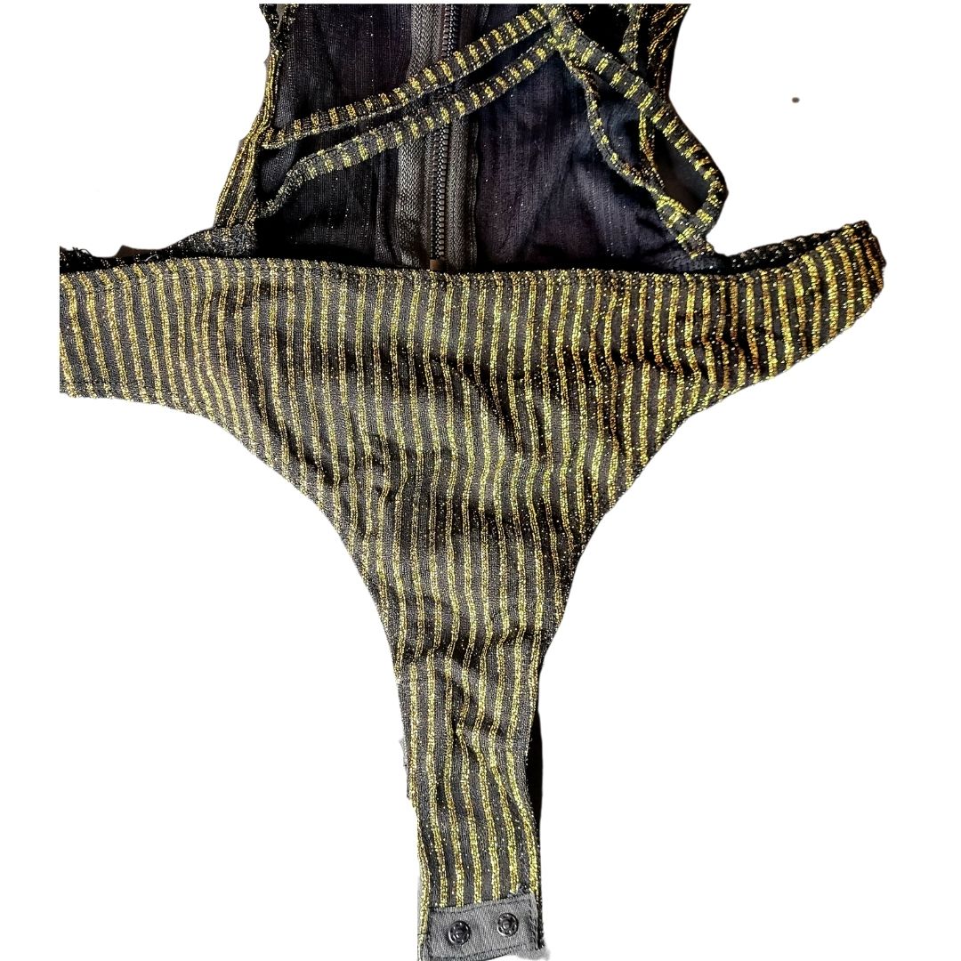 This dancers wardrobe inspired bodysuit is built for the mature athlete beauty stepping out! Turn heads as you sparkle in gold! The bottom of the top comes with an easy 3-snap to secure the top with a comfortable feel. This nylon stretch with back & side strap detail bodysuit is the perfect mix of Beauty & Beast!