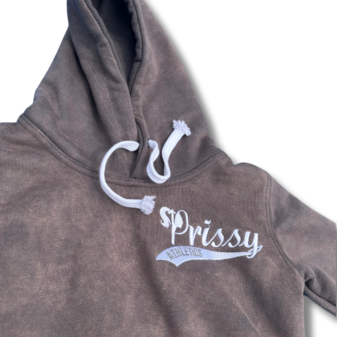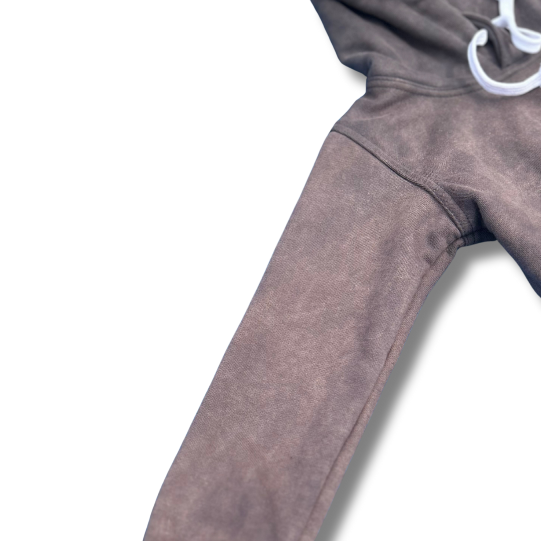 Power in every detail. This slightly cropped hoodie is made from soft gray washed fleece with bold, distressed cloth letters on the back that say it all. The athletic fit and oversized vibe give it that model-walk energy — made for female athletes who bring both grace and grit.