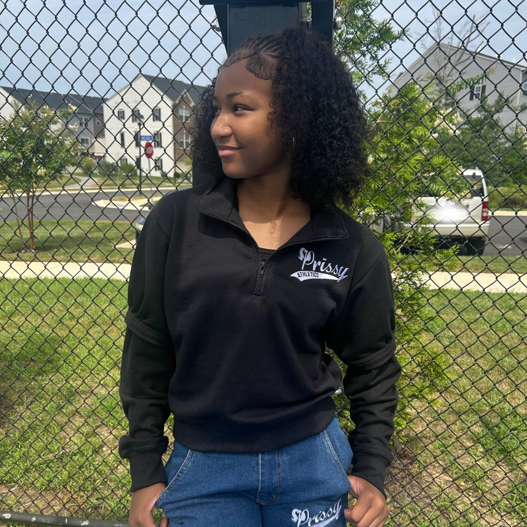 The Playmaker Zip is built for your starting lineup. Jet black with a clean 3/4 zip front, removable hood, and soft-but-sturdy fleece, it’s your go-to piece for switching up your style without switching out your look. The Prissy Athletics logo is fully embroidered on the left chest, giving it a clean, classic finish.