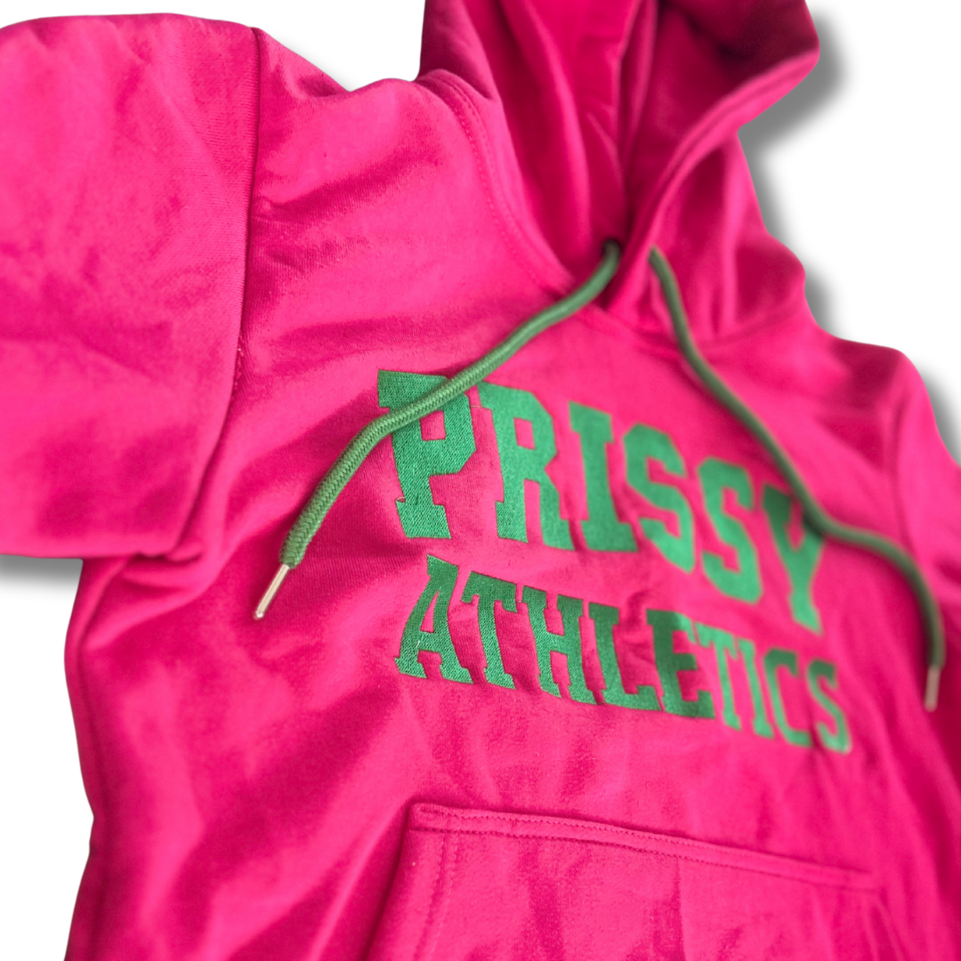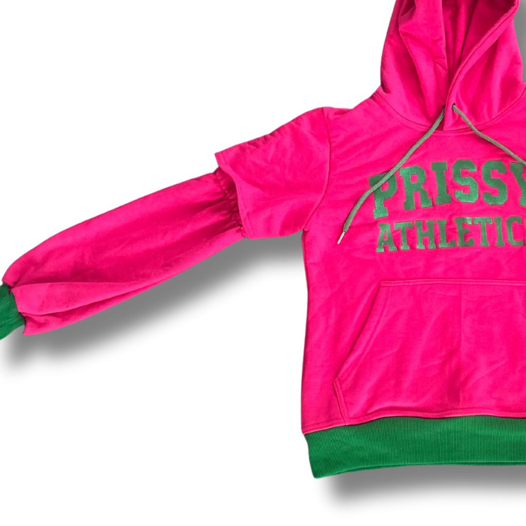 A hoodie with attitude. The Varsity Vibe Hoodie features bold embroidered Prissy Athletics lettering and a layered sleeve design inspired by vintage game-day uniforms. It’s cozy, sporty, and built to turn heads — whether you're courtside, in class, or on the runway. Models are wearing a size Youth Small. (Check the sleeves! We've made them slightly longer than average for the tall girlies!!) Runs true to size. Order a size up for a looser fit.